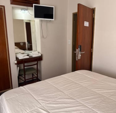 Cómoda habitación para dos personas con cama matrimonial, aire acondicionado, Tv, escritorio y Wi-Fi gratuito.